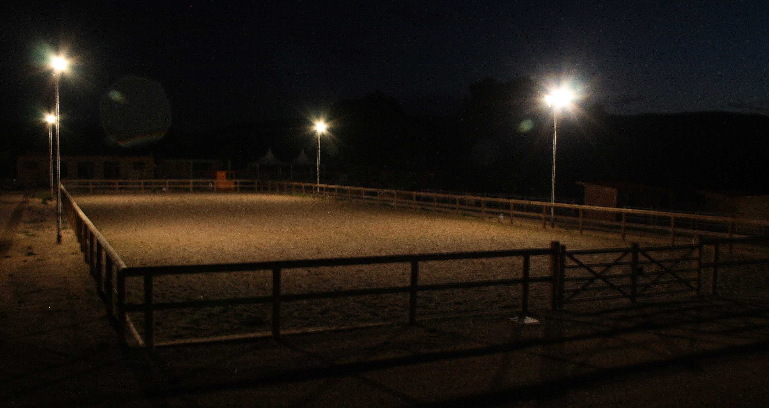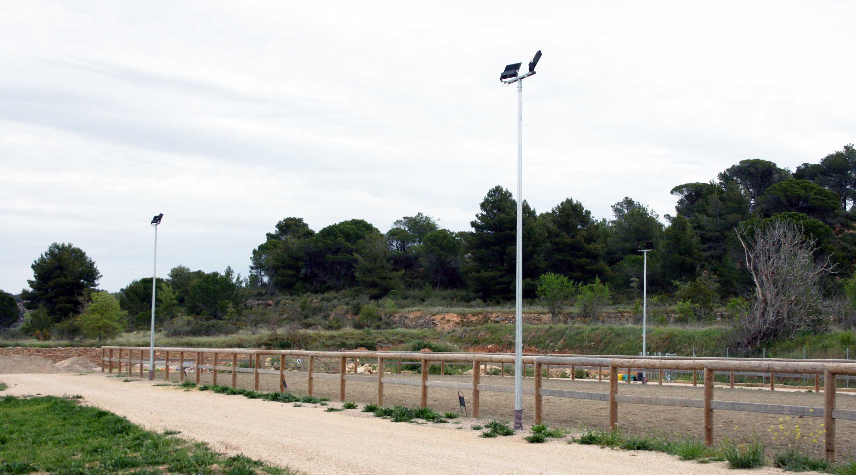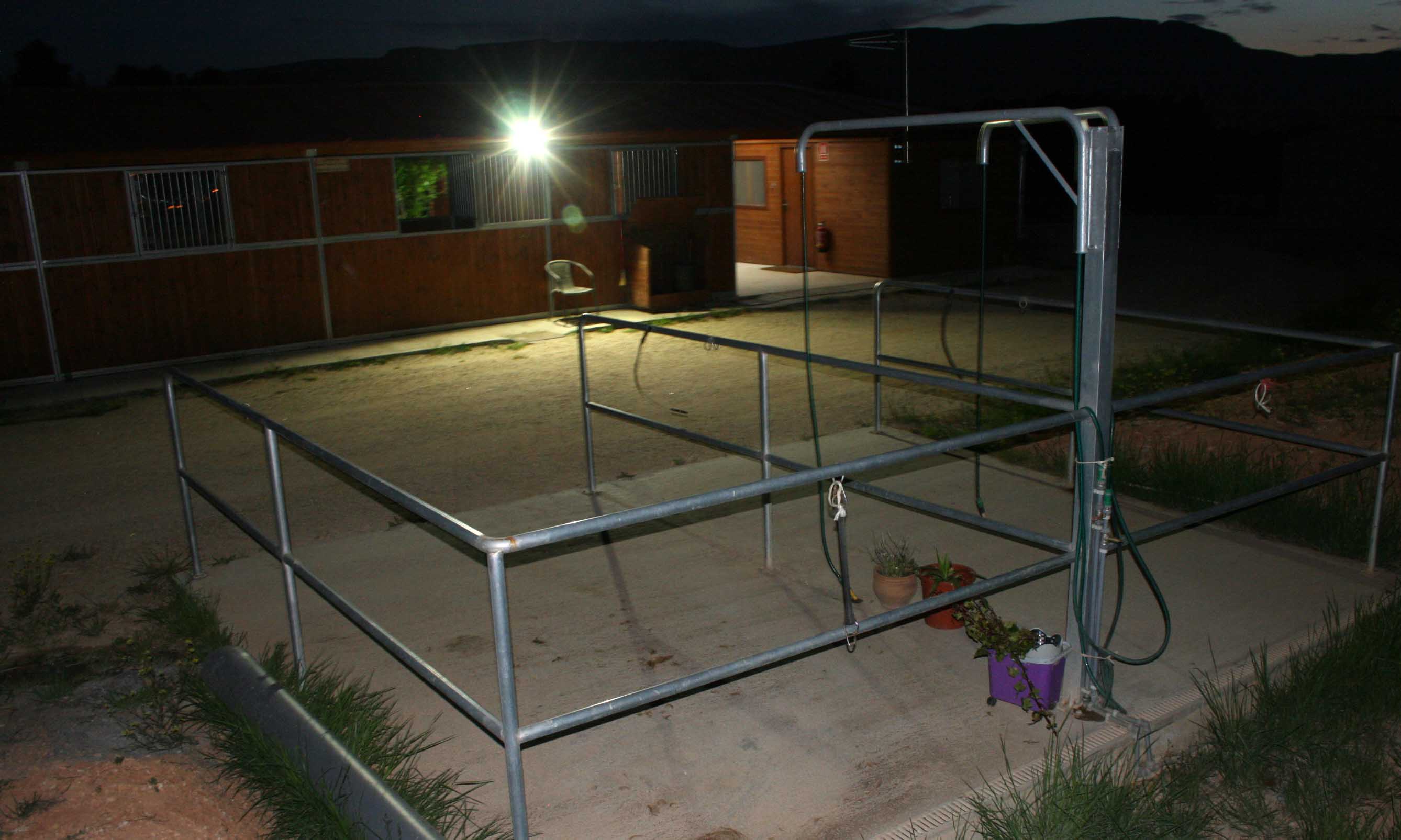 Una autèntica joia. És una pista de 60 x 20m, vallada amb fusta sense cantoneres. El sòl està fet amb elements sintètics que simulen una pista de carreres de cavalls i permeten disposar en tot moment d’una superfície de treball en condicions òptimes.